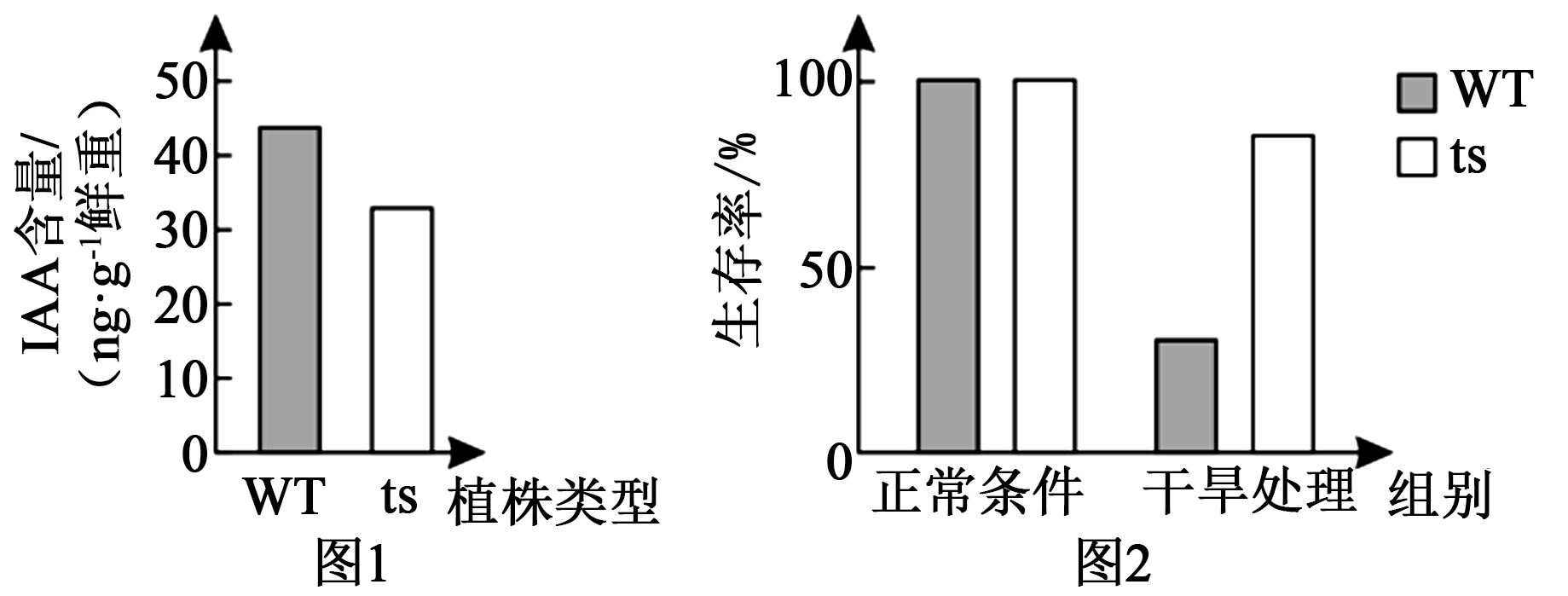 "]自变量是指在实验中被研究者主动操纵或改变的变量,其变化可能对结果产生影响,分析题图和题意可知该实验自变量为植株类型($\rm WT$和$\rm ts$)和处理条件(正常和干旱)。