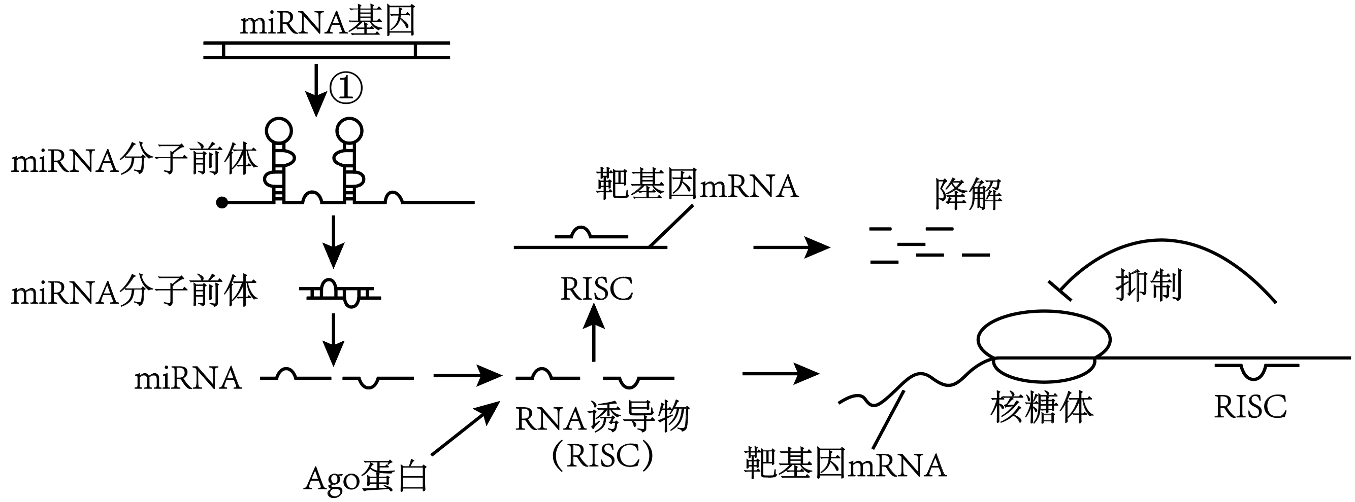 基因表达包括转录和翻译。转录是以$\rm DNA$的一条链为模板合成$\rm RNA$的过程。翻译是以$\rm mRNA$为模板合成具有一定氨基酸顺序的蛋白质的过程。由图可知:①是由$\rm miRNA$基因产生$\rm miRNA$分子前体,是转录过程。$\rm miRNA$是大分子,需要从核孔运出细胞核。