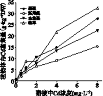 为筛选适合白洋淀镉污染修复的沉水植物,用不同浓度镉溶液处理本地$\rm 4$种沉水植物$\rm 4$天后,检测其对镉($\rm Cd$)的耐受性和富集能力,结果如表和图。