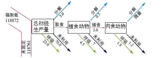 肉食动物是第三营养级,其同化的能量是$\rm 1.2+1.8=3$,而植食动物是第二营养级,其同化的能量$\rm =3+7+0.5+4.5=15$,所以二者之间的传递效率是$\rm 3/15=20\%$,能量流动的特点是单向流动、逐级递减。