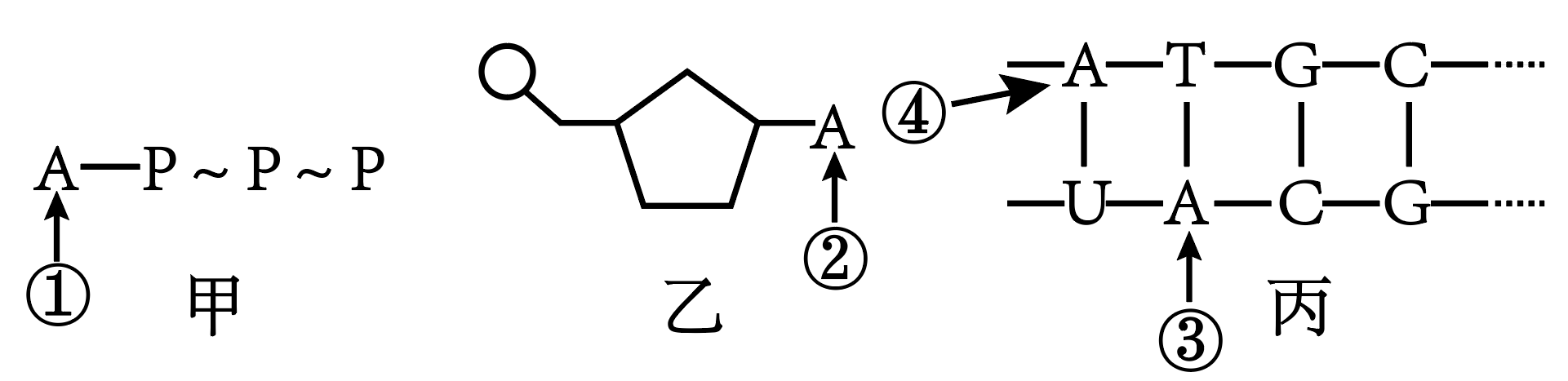 ①为腺嘌呤,甲表示$\\rm ATP$