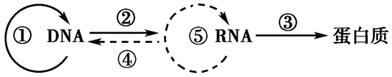 "]图示为中心法则的内容,其中①表示$\rm DNA$分子的自我复制;②表示转录过程;③表示翻译过程;④表示逆转录过程;⑤表示$\rm RNA$分子的自我复制过程。