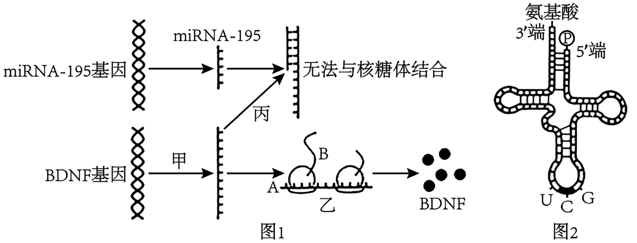 "]]图中显示,$\rm miRNA-195$基因转录出的$\rm miRNA-195$与$\rm BDNF$基因转录出的$\rm mRNA$能够发生部分的碱基互补配对,因而阻止了相应的$\rm mRNA$的翻译过程,即$\rm miRNA-195$基因调控$\rm BDNF$基因表达的机理是$\rm miRNA-195$与$\rm BDNF$基因表达的$\rm mRNA$形成局部双链结构,从而使$\rm BDNF$基因表达的$\rm mRNA$无法与核糖体结合导致的。若$\rm BDNF$基因表达受阻,则会导致精神分裂症的发病,因此,精神分裂症患者与正常人相比,丙过程增强。
