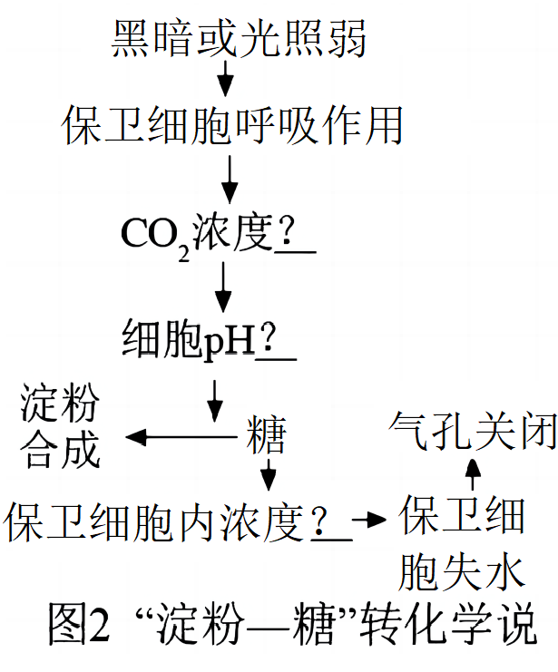 根据图$\rm 2$“淀粉$\rm -$糖”转化学说推测,当植物处于黑暗或光照弱时,保卫细胞光合作用停止或减弱,但呼吸作用仍进行,细胞呼吸会吸收氧气、产生二氧化碳,则细胞中$\rm CO_{2}$浓度会上升,二氧化碳溶于水形成碳酸,则$\rm pH$值下降,可溶性糖转化成淀粉,导致保卫细胞的浓度下降,细胞失水,气孔关闭。