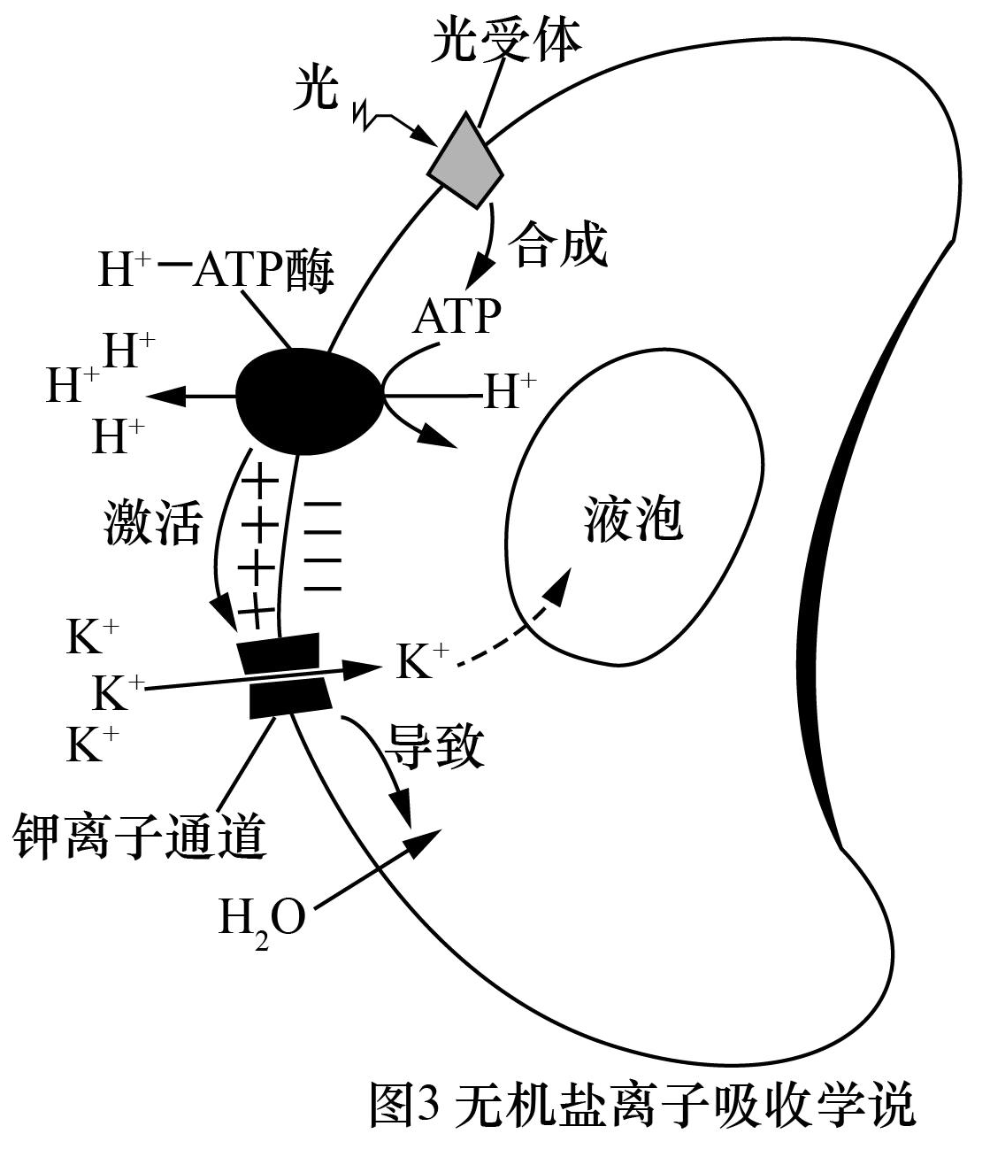 根据图$\rm 3$无机盐离子吸收学说推测,光照能促进细胞中$\rm ATP$的合成,进而促进$\rm H^{+}$的外排,激活了钾离子通道,促进细胞以协助扩散的方式增加$\rm K^{+}$的吸收量,引起细胞吸水,最终导致气孔的开启。