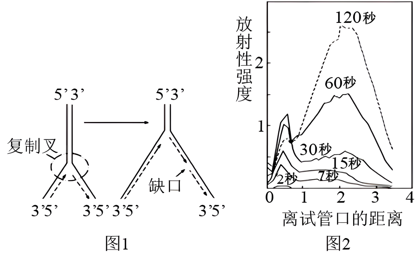 为验证这一假说,冈崎进行了如下实验:让$\rm T4$噬菌体在$\rm 20^\circ\rm C$时侵染大肠杆菌$\rm 70\;\rm min$后,将同位素$\rm ^{3}H$标记的脱氧核苷酸添加到大肠杆菌的培养基中,在$\rm 2\;\rm s$、$\rm 7\;\rm s$、$\rm 15\;\rm s$、$\rm 30\;\rm s$、$\rm 60\;\rm s$、$\rm 120\;\rm s$后,分离$\rm T4$噬菌体$\rm DNA$;接下来,通过加热使$\rm DNA$分子变性、全部解旋,再进行密度梯度离心,以$\rm DNA$单链片段分布位置确定片段大小(分子越小离试管口距离越近),并检测相应位置$\rm DNA$单链片段的放射性,实验结果如图$\rm 2$。