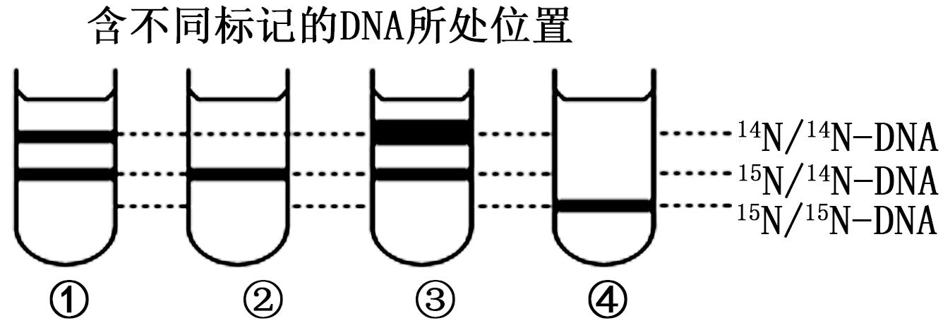 生物学家在探究$\rm DNA$ 复制方式时,将大肠杆菌在含有¹⁵$\rm N$的培养液中繁殖数代后,其$\rm DNA$几乎都是¹⁵$\rm N$标记的,然后将上述大肠杆菌转移到含¹⁴$\rm N$的普通培养液中培养,在不同时刻收集大肠杆菌并提取其$\rm DNA$,再将提取的$\rm DNA$进行离心,记录离心后试管中 $\rm DNA$的位置,结果如图①~④所示。下列相关叙述正确的是$\rm (\qquad)$