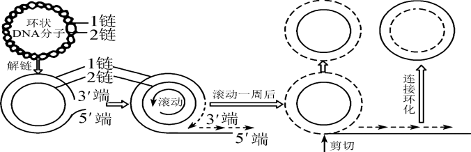 $\rm B$、由题意“随后$\rm DNA$分子以$\rm 2$链为模板,通过滚动从$\rm 1$链的$\rm 3^\prime$端开始延伸子链”和题图可知外链充当了$\rm 1$链延伸时的引物,需要$\rm DNA$聚合酶、解旋酶的催化作用,$\rm B$正确;
