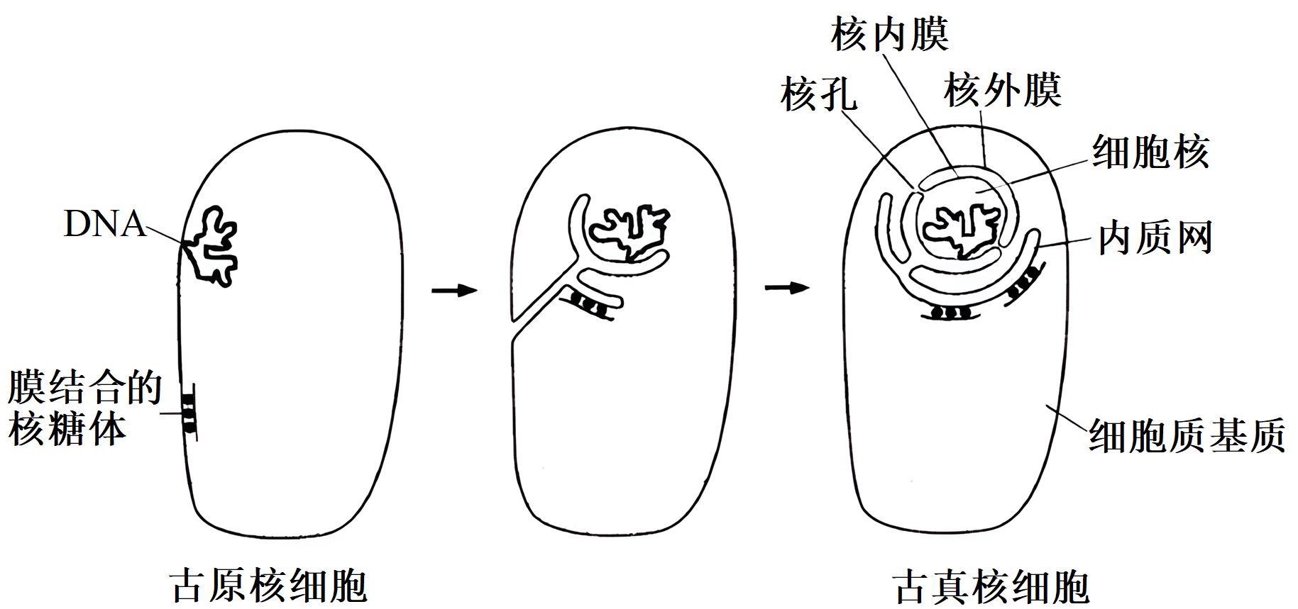 核膜和内质网膜可能由细胞膜的内陷演化而来,这一假设如下图所示。