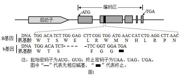 $\rm B$基因编码水稻花药正常发育必要的另一种转录因子,纯合的$\rm B$基因突变体($\rm bb$)在长日照条件下雄性半不育(花粉只有$\rm 50\%$可育),短日照条件下育性正常,$\rm BB$和$\rm Bb$在长日照、短日照条件下均育性正常。对$\rm B$和$\rm b$基因的测序结果如图$\rm 1$.