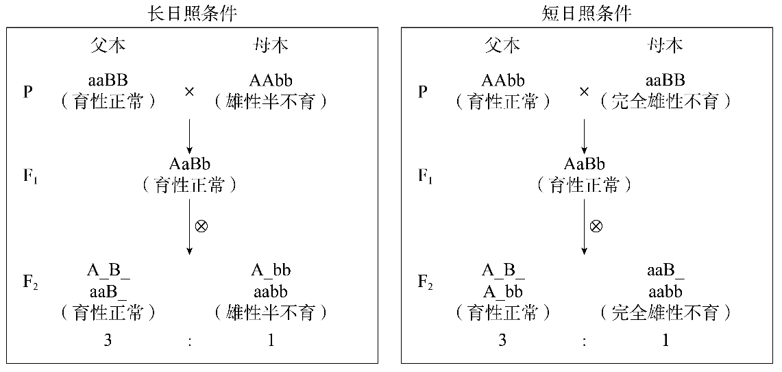 "]]由图$\rm 2$结果可知,野生型在长日照和短日照条件下花粉全育,双隐性突变体在长日照条件想花粉育性为$\rm 50\%$,而在短日照条件下,花粉育性为$\rm 0$。因此双隐性突变体的表型是在长日照条件下,花粉半不育,短日照条件下花粉全不育,$\rm A$、$\rm B$基因的作用关系为相互独立,长短日照条件下野生型花粉的育性与双隐突变体没有关系。