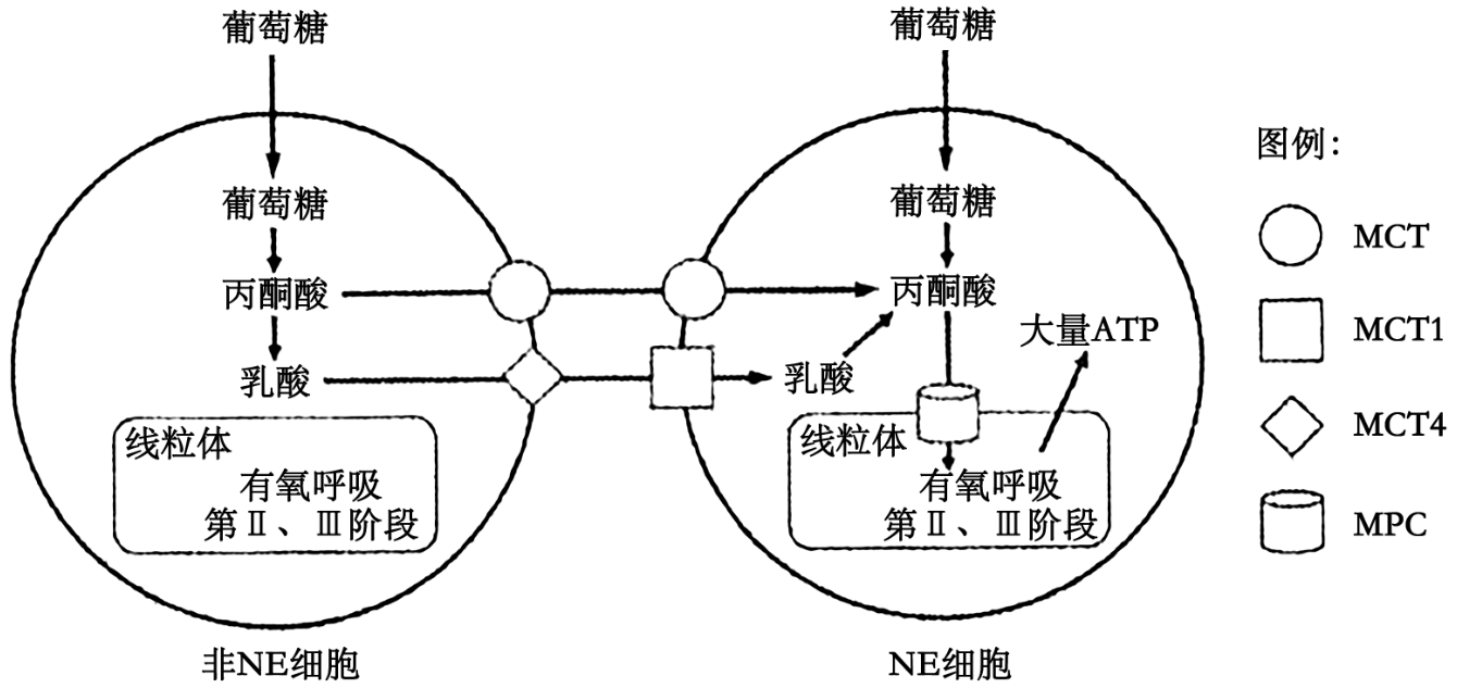 请根据文中相应内容,使用图例与箭头表征$\rm NE$细胞的代谢机制,完善答题纸上的图示模型 。