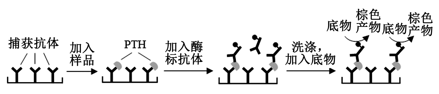 "]]① 据图分析,捕获抗体和酶标抗体与待测样本中$\rm PTH$的关系是:捕获抗体和酶标抗体特异性结合于$\rm PTH$的不同位点。②据图可知,$\rm PTH$与捕获抗体结合后,再加入酶标抗体。经洗涤丙加入底物后可产生棕色底物,且在一定范围内棕色的深浅与样品中 $\rm PTH$含量呈正相关,故可通过检测显色反应后棕色的深浅来测定$\rm PTH$的含量。