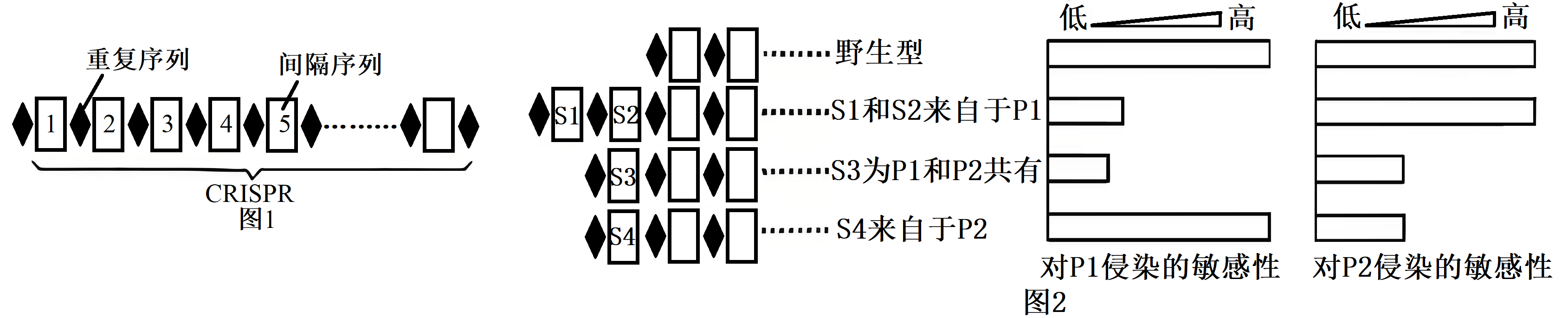 研究发现,间隔序列中往往会有一些来自噬菌体的$\rm DNA$片段。科学家假设:$\rm CRISPR/Cas$是细菌在长期消化过程中形成的用以保护自身对抗病毒的适应性免疫防御系统。为此,科学家用两种噬菌体($\rm P1$和$\rm P2$)侵染野生型嗜热链球菌,对幸存的嗜热链球菌进行培养,研究其对噬菌体侵染的敏感性与$\rm CRISPR$的关系,实验结果如图$\rm 2$所示,据结果可判断上述假设成立。