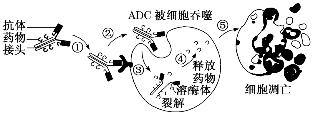 抗体偶联药物$\rm (ADC)$是将高特异性的单克隆抗体和小分子细胞毒性药物,通过接头进行高活性结合而成。如图是$\rm ADC$作用原理简图。下述有关$\rm ADC$的叙述正确的是$\rm (\qquad)$