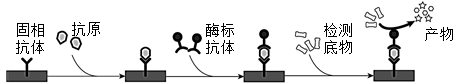 "]]固相抗体和酶标抗体均能与抗原结合,这是由于不同抗体与同一抗原表面的不同部位结合。其中固相抗体的作用是固定待测抗原。该检测方法中,酶标抗体的作用是与待测抗原结合并由酶催化检测底物反应,这样就可以通过测定酶反应产物量来判断待测抗原量。