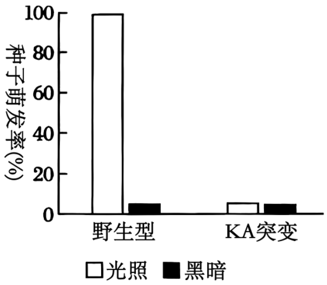 "]]为了排除内源$\rm KA$和$\rm GA$的影响,实验材料选择$\rm KA$和赤霉素双突变的种子。根据柱形图信息,与对照组相比,单独$\rm GA$处理种子不萌发,$\rm KA$、$\rm GA$双处理和$\rm KA$单处理都能够促进种子萌发,促进效果相当,说明$\rm GA$位于$\rm KA$的上游,不影响$\rm KA$发挥作用。