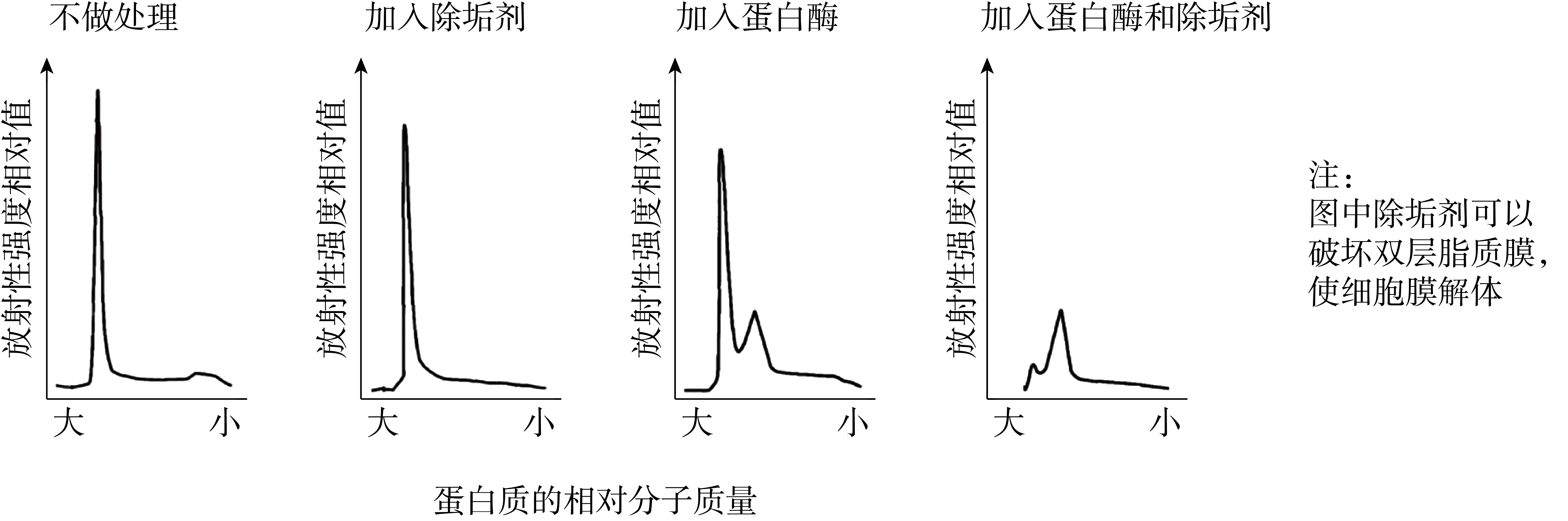 $\rm D$、加入除垢剂放射性只是减少一点,因此可以推知除垢剂破坏的这一部分蛋白质只是少量,而除垢剂可以破坏的蛋白质属于那些跨膜蛋白,由于嵌入磷脂双分子层中的膜蛋白由一些非极性氨基酸组成,与脂质分子的疏水尾部相互结合,并且结合的一般非常牢固,只有破坏脂双层使膜崩解后,才能分离出来。由此可知该蛋白应该存在两个不同部分,除垢剂这是膜内部分,应该还有膜外部分没有被除垢剂影响,$\rm D$正确。