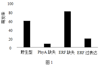 "]]由图$\rm 1$实验结果分析,$\rm ERF$缺失突变体组的种子萌发率高于野生型,$\rm ERF$过表达突变体组的种子萌发率低于野生型,且$\rm phyA$缺失突变体组的种子萌发率最低,由结果可以推测,$\rm phyA$激活的条件下$\rm ERF$蛋白能够抑制种子的萌发,降低种子的萌发率。