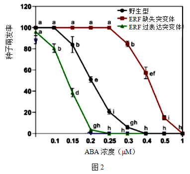 为了进一步探究$\rm ERF$蛋白影响种子萌发的机制,科研人员用不同浓度的脱落酸($\rm ABA$)分别处理上述不同组拟南芥的种子,统计种子萌发率,见图$\rm 2$。结果说明$\rm ERF$提高了拟南芥种子对外源$\rm ABA$的 。
