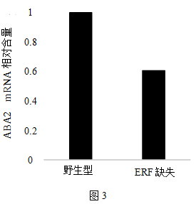 "]]由图$\rm 3$实验结果分析,$\rm ERF$缺失突变体种子中$\rm ABA2$的$\rm mRNA$含量低于野生型,说明$\rm ERF$(一种胞内蛋白)能促进脱落酸合成酶基因的转录,从而促进脱落酸合成酶的合成,使种子中脱落酸含量增多,从而抑制拟南芥种子的萌发,而$\rm ERF$缺失突变体种子中缺少$\rm ERF$,合成脱落酸合成酶减少,种子中脱落酸含量减少,种子的萌发率增大。