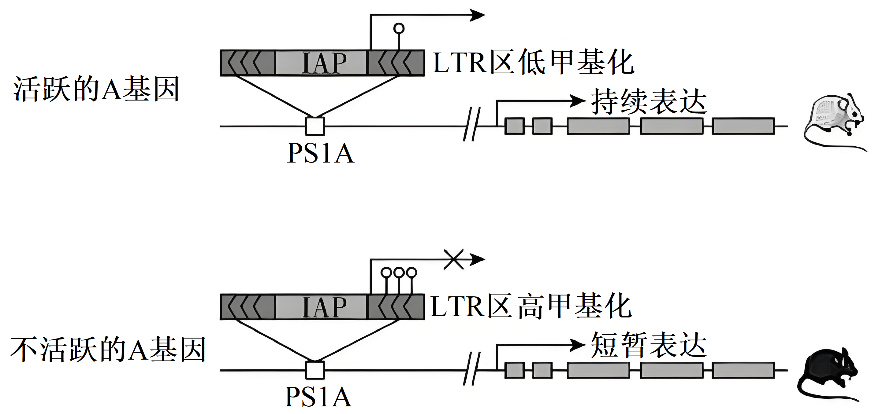 复等位基因$\rm A^{vy}/A/a$在小鼠毛色的遗传中起着关键作用,$\rm A$基因令小鼠毛色表现为胡椒色,$\rm a$基因令小鼠毛色表现为黑色。$\rm A^{vy}$基因是在$\rm A$ 基因编码区上游的$\rm PSIA$ 内插入$\rm IAP$ 序列所得,$\rm IAP$ 可作为启动子促使相关基因持续表达,令小鼠毛色表现为黄色,而其中$\rm LTR$区发生高甲基化会使$\rm IAP$作用消失(机制如图所示)。下列有关说法正确的是$\rm (\qquad)$