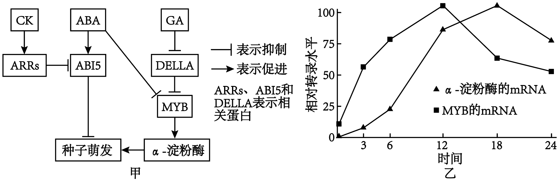 小麦是我国主要粮食作物之一,为我国丰富的面食文化奠定基础。研究发现小麦种子萌发与赤霉素 ($\rm GA$)、细胞分裂素 ($\rm CK$)和脱落酸($\rm ABA$)的关系如图甲所示。进一步研究用赤霉素处理种子后$\rm MYB$蛋白与$\rm \alpha-$淀粉酶表达情况如图乙所示。下列有关说法错误的是$\rm (\qquad)$