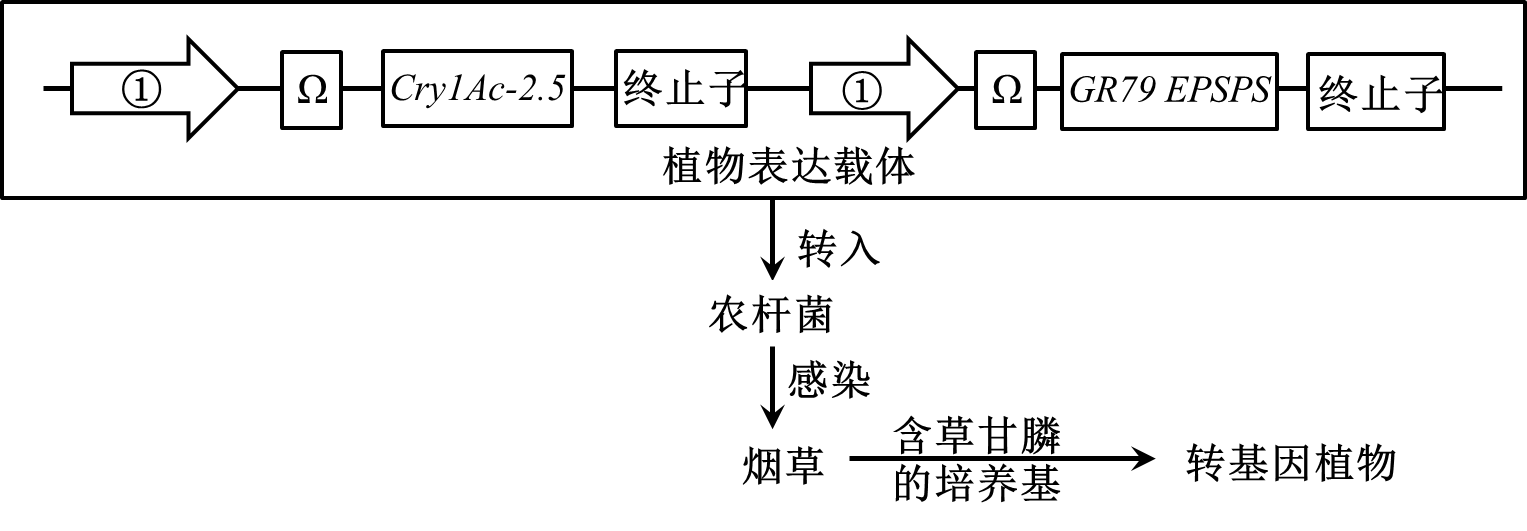 注:“$\rm Cry1Ac-2$.$\rm 5$”表示人工合成杀虫基因,“$\rm GR79$ $\rm EPSPS$”表示草甘膦抗性基因,“$\rm \Omega$”表示增强基因表达的序列。