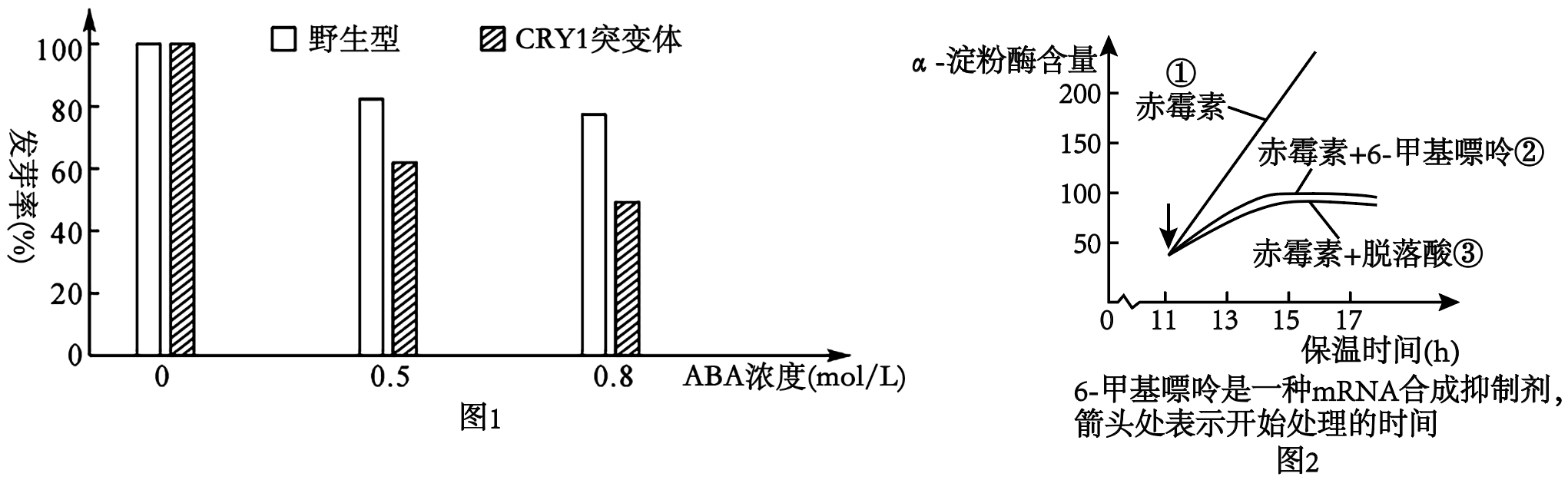 拟南芥种子中的隐花色素($\rm CRY1$)是感受光的受体。研究发现,$\rm CRY1$能作用于脱落酸($\rm ABA$)从而影响种子萌发。为了进一步探究其作用机制,研究人员将野生型拟南芥的种子和$\rm CRY1$突变体(无法合成$\rm CRY1$)的种子,分别放在含$\rm 0\;\rm mol/L$、$\rm 0.5\;\rm mol\;\rm L$、$\rm 0.8moVLABA$的培养基中,置于适宜光照条件下培养,一段时间后测得种子的发芽率如图$\rm 1$所示。研究小组分别用三组试剂(①②③)对拟南芥种子进行处理,结果如图$\rm 2$所示。据图推测错误的是$\rm (\qquad)$