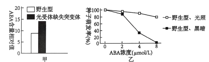 科研人员为研究光和脱落酸($\rm ABA$)对种子萌发的影响,测定了野生型植株和光受体缺失突变体中$\rm ABA$的含量(结果如图甲所示)和不同处理下的野生型植株种子萌发率(结果如图乙所示)。