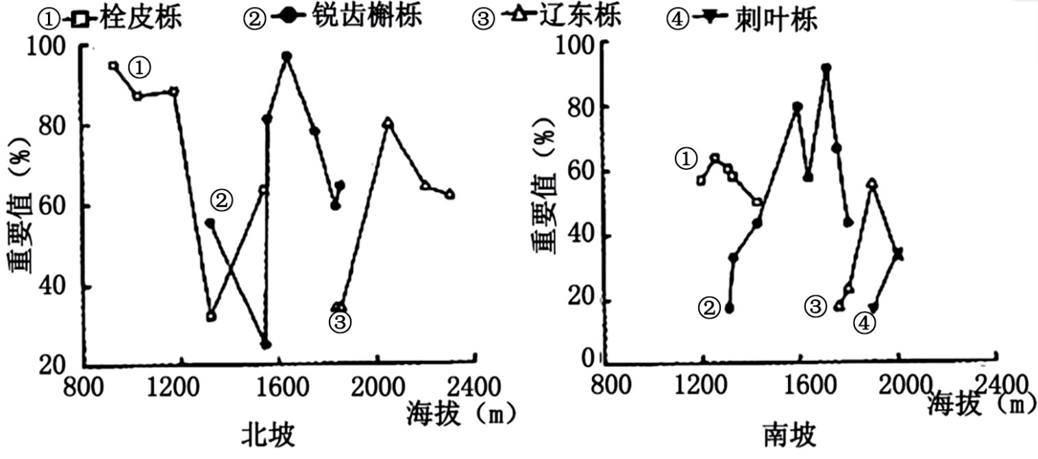 $\rm A$、从种类和范围角度分析,与南坡相比,北坡栎树缺少刺叶栎,分布的特点是种类少、分布范围广,高低海拔均有分布,$\rm A$正确;