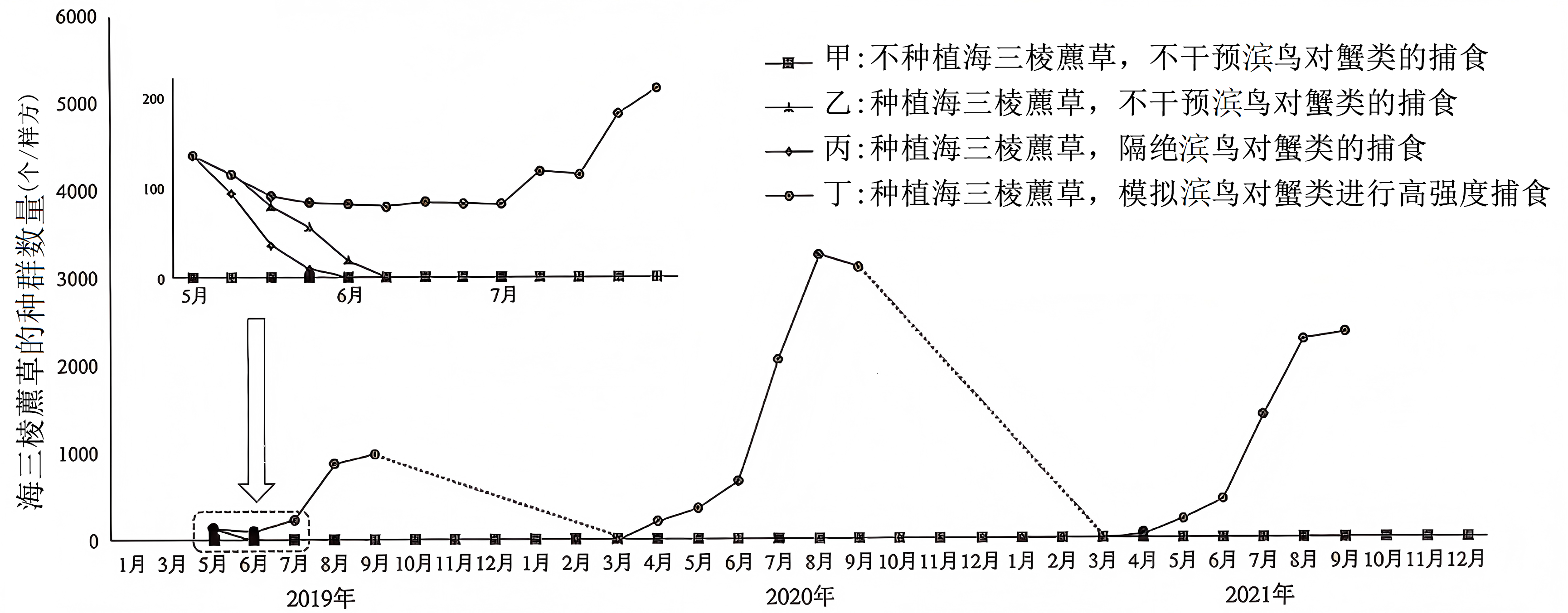 ②实验结果显示,丁组(种植海三棱薦草,模拟滨鸟对蟹类进行高强度捕食)的海三棱薦草数量显著高于其他组,说明在滨鸟的作用下,蟹类减少而导致海三棱薦草增加,据此推测蟹类取食强度过大(蟹类数量过多$\rm /$滨鸟对蟹类捕食不足)导致植被难以恢复;乙(种植海三棱薦草,不干预滨鸟对蟹类的捕食)、丙组(种植海三棱薦草,隔绝滨鸟对蟹类的捕食),两组的自变量是滨鸟对蟹类有无捕食,实验结果显示海三棱薦草数量无显著差异,推测原因是该湿地中滨鸟数量少导致乙、丙组蟹类数量差异不大。