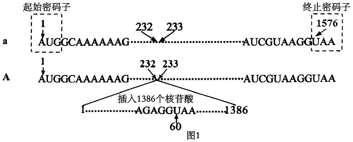在与$\rm a$基因的$\rm mRNA$比对时发现$\rm A$基因的$\rm mRNA$多了$\rm 1386$个核苷酸,插入位置如图$\rm 1$所示。据图分析,$\rm AAX^{B}Y$与$\rm aaX^{B}Y$的个体尾鳍形状不同的机制是 。
