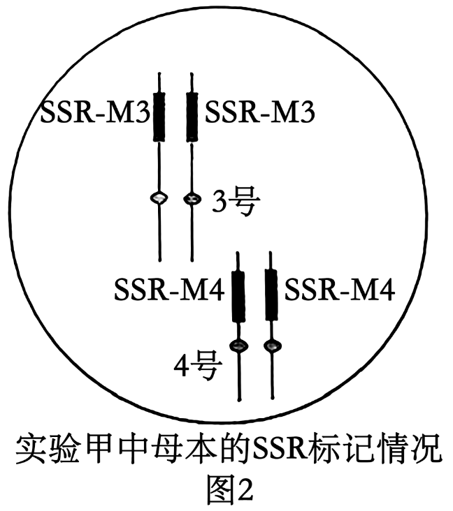 $\rm SSR$是染色体中的简单重复$\rm DNA$序列,非同源染色体上的$\rm SSR$、不同品种的同源染色体上的$\rm SSR$都不同,利用电泳技术可将其分开,并用于基因定位。若上述$\rm A/a$基因位于$\rm 3$号或$\rm 4$号染色体上,为了确定其所在染色体,将实验甲中母本的$\rm 3$号和$\rm 4$号染色体上特有的$\rm SSR$分别记为$\rm SSR-M3$、$\rm SSR-M4$(如图$\rm 2$所示),选实验甲中$\rm F_{1}$的部分精子的$\rm DNA$为模板进行$\rm PCR$并进行电泳检测,部分结果如下表(能反映理论值)所示。
