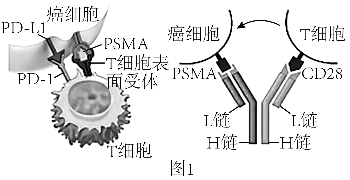 $\rm CD28$是$\rm T$细胞表面受体,$\rm T$细胞的有效激活依赖于$\rm CD28$在癌细胞与$\rm T$细胞结合部位的聚集。因此,科研人员尝试构建既能结合$\rm PSMA($癌细胞表面的抗原蛋白$\rm )$,又能结合$\rm CD28$的双特异性抗体$\rm PSMA\times CD28$,诱导$\rm T$细胞定向杀伤癌细胞,如图$\rm 1$所示。回答下列问题。