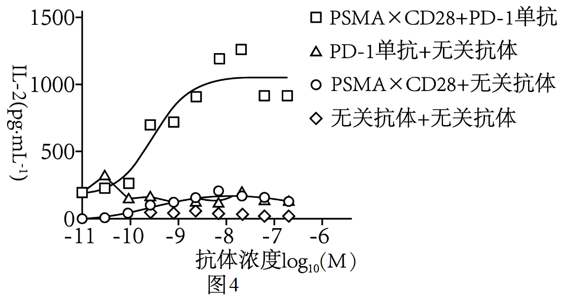 "]]自变量是抗体种类,分析图$\rm 3$可知,$\rm PSMA\times CD28+PD-1$单抗联合使用能够显著激活$\rm T$细胞,且在一定范围内激活作用随$\rm PSMA\times CD28$浓度的增加而增强;单独使用$\rm PSMA\times CD28$或$\rm PD-1$单抗都不能显著激活$\rm T$细胞。
