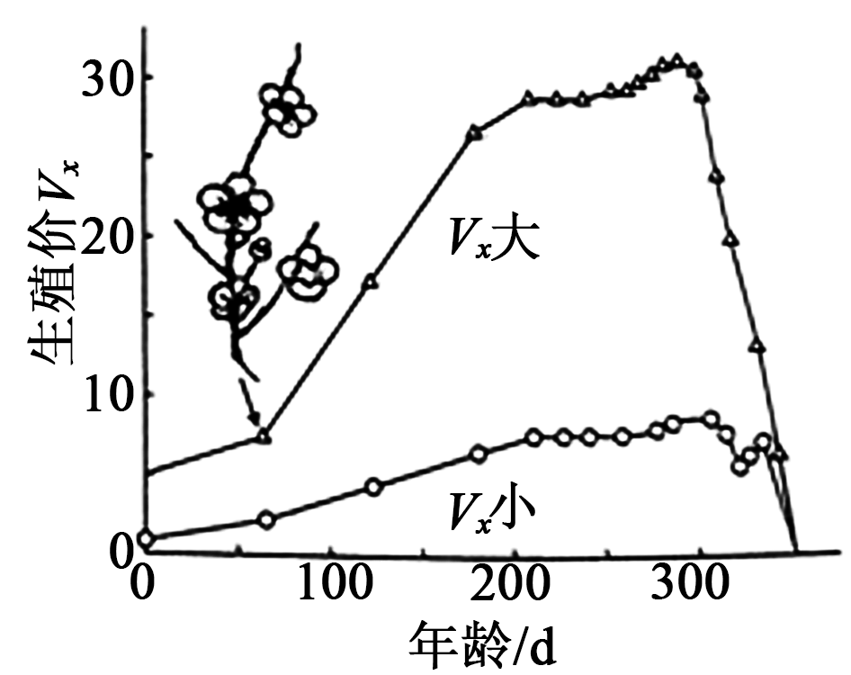 "]分析图示可知,大型小天蓝绣球植株的生殖价在$\rm 300$天左右达到最高值;小于$\rm 300$天时,随着年龄的增大,生殖价增大;大于$\rm 300$天时,随着年龄的增大,生殖价减小,约$\rm 350$天以后,生殖价降为$\rm 0$。小型小天蓝绣球植株的生殖价低于大型小天蓝绣球植株。