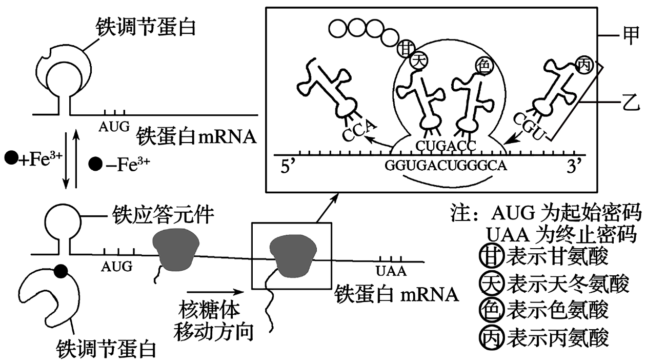 $\rm B$、当铁调节蛋白与铁应答元件结合时,铁蛋白$\rm mRNA$无法被翻译,当细胞中游离的$\rm Fe^{3+}$浓度升高时,铁调节蛋白脱离铁应答元件,核糖体与铁蛋白的$\rm mRNA$结合,使铁蛋白表达量上升,$\rm B$错误;