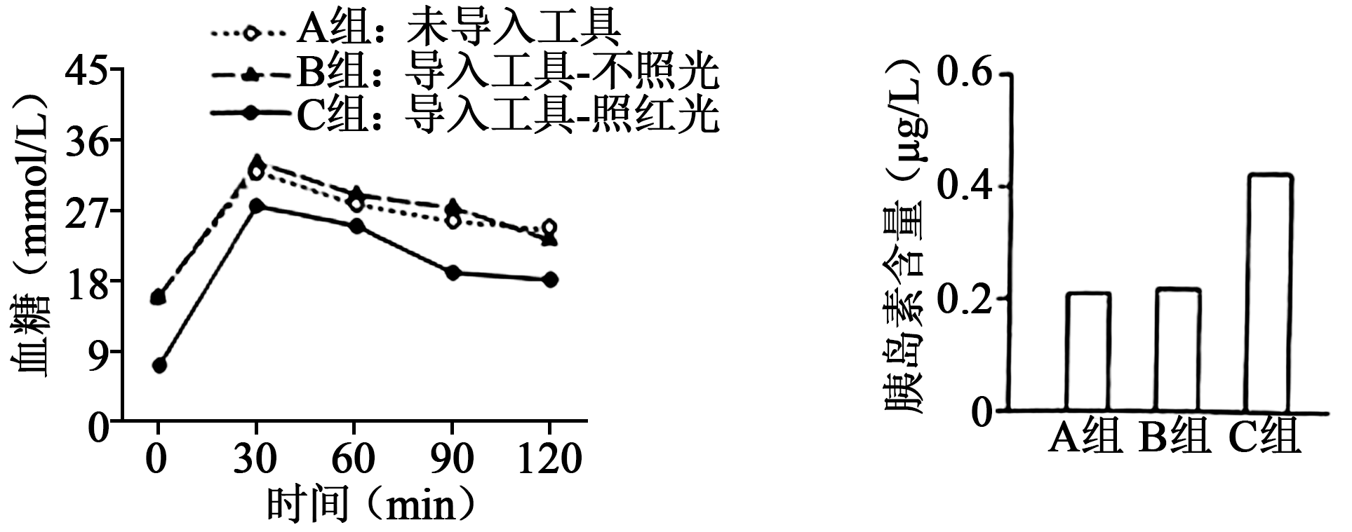 "]]$\rm A$组未导入工具,$\rm B$组导入工具$\rm -$不照光,$\rm C$组导入工具$\rm -$照红光。从图中可以看出,$\rm C$组照红光后胰岛素含量明显高于$\rm A$组和$\rm B$组,说明导入工具并红光照射可显著提高胰岛素的表达,从而降低血糖水平。胰岛素具有降低血糖的作用,$\rm 30\;\rm min$后,$\rm C$组小鼠的血糖随时间逐渐下降,胰岛素含量随之逐渐下降;