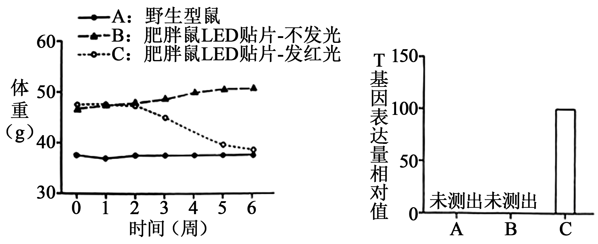 "]]从图中可知,野生型鼠($\rm A$)和肥胖鼠$\rm LED$贴片$\rm -$不发光($\rm B$)时,$\rm T$基因表达量未测出,而肥胖鼠$\rm LED$贴片$\rm -$发红光($\rm C$)时,$\rm T$基因表达量显著升高。推测改造后的工具可实现小鼠减重的机理是红光照射使肥胖鼠中$\rm T$基因表达量增加,$\rm T$基因的表达产物促进能量代谢(或促进脂肪分解等),从而使小鼠减重。