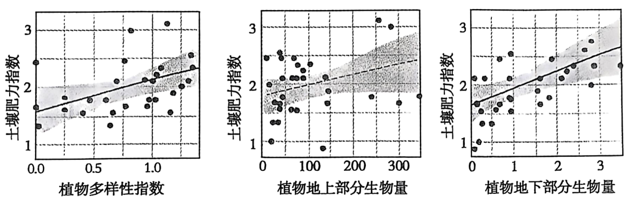 ①分析图标得出,土壤肥力的变化与植物多样性指数和植物地下部分生物量均成正相关关系,植物地上部分生物量与土壤肥力关系不显著。
