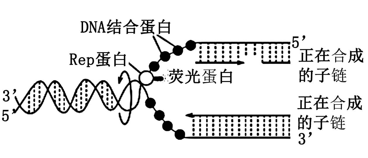 "]$\rm A$、因为用荧光蛋白标记了 $\rm Rep$ 蛋白(解旋酶),$\rm Rep$ 蛋白参与 $\rm DNA$ 解旋过程, $\rm DNA$边解旋边复制,所以通过观察荧光蛋白的运动情况,能够大致推测出 $\rm DNA$ 的复制速率,$\rm A$正确;
