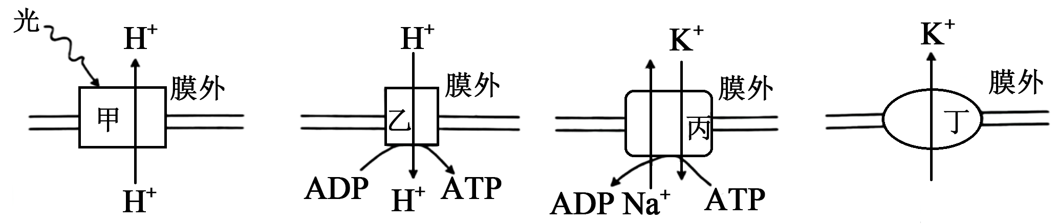 离子对于维持细胞的生命活动具有重要作用,离子进出细胞一般要借助转运蛋白。如图表示甲$\rm \sim $丁四种转运蛋白在运输相关离子时的示意图,下列与图示对应的运输方式正确的是$\rm (\qquad)$
