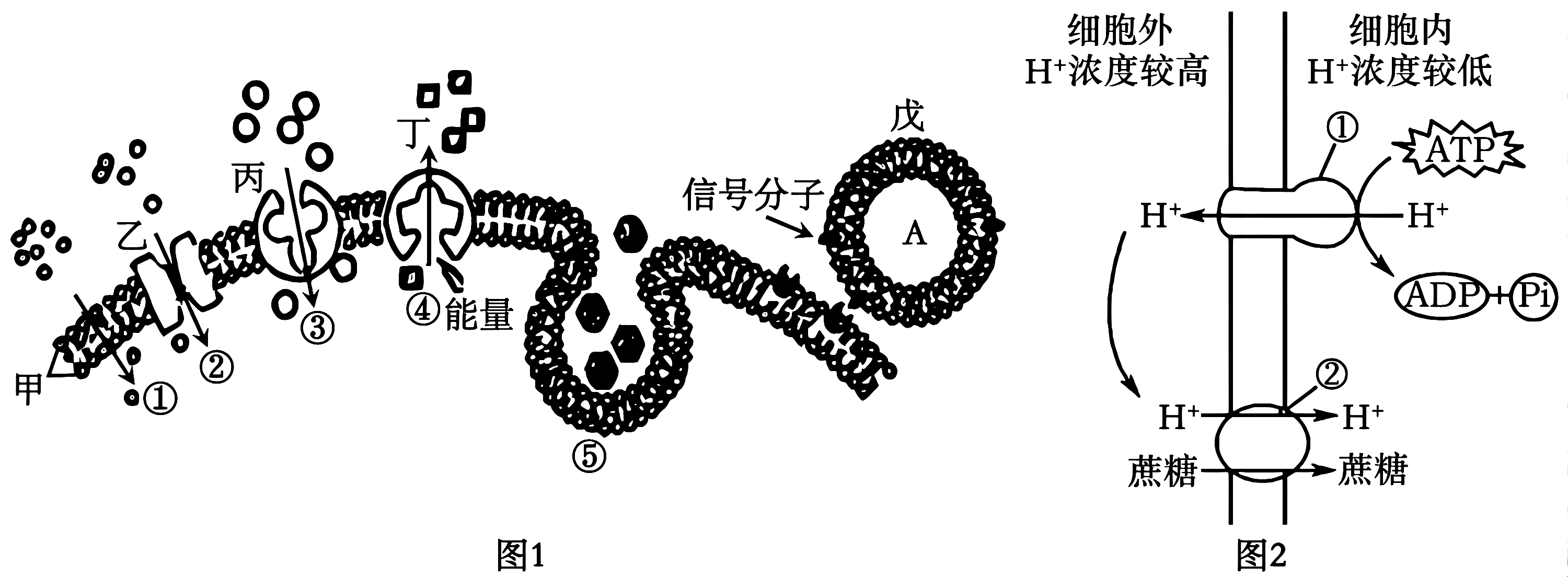 细胞是一个开放的系统,每时每刻都与环境进行着物质交换。图$\rm 1$中①$\rm \sim $⑤表示物质进出细胞方式,甲$\rm \sim $戊表示不同的物质或细胞结构,图$\rm 2$为蔗糖分子进入某植物细胞的过程示意图。下列相关说法错误的是$\rm (\qquad)$